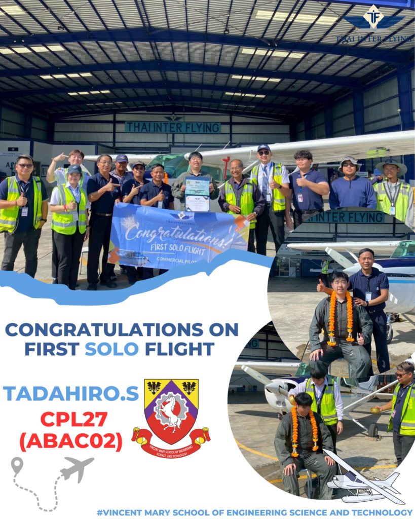 The Vincent Mary School of Engineering, Science and Technology (VMES) is proud to congratulate our student, Mr. Tadahiro S. (CPL Student Batch 27, ABAC02), on successfully completing his First Solo Flight.